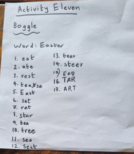 Activity 11 for my term break activities I had to write as many words I can with the word Easter. It was pretty easy finding 3 letter word but it got harder when I got to 17 words so I thought I could stop there. My trick to getting 17 words are to take a word that you got and rearrange the letters a bit to make a new word. I’m pretty happy with the score I’ve gotten so comment if you think you beat 17 words.